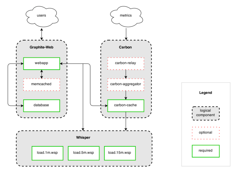 Metrics are sent to the stack via the Carbon service, which then writes the data to Whisper for long-term storage. Users interact using the Graphite Web UI or API front end, which queries Carbon and Whisper to fetch the data and show it in graphs.