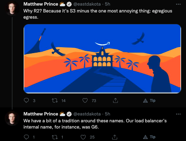 “R2” is a clever play on the name styling of Cloudflare R2’s main incumbent competitor, Amazon S3, which stands for Simple Storage Service. At this point we think it will officially be a stand in for “Rapid” and “Reliable”, but according to Cloudflare, R2 is also a stand in for any one of the following: